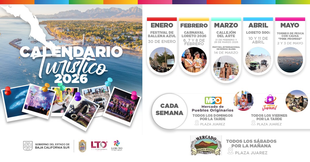 Loreto, Baja California Sur, se prepara para un 2026 lleno de cultura, música, naturaleza y tradiciones. Desde festivales icónicos como el Festival de la Ballena Azul hasta celebraciones semanales en la Plaza Juárez, este Pueblo Mágico ofrece una agenda vibrante para viajeros que buscan experiencias auténticas.